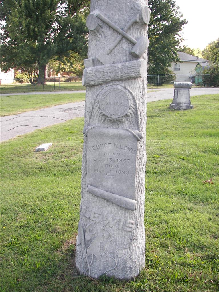 | LEWIS, George W. | Oct. 15, 1857 | May 1, 1898 | Research Note: Woodman of the World marker. "WOW MONETT CAMP 149 DVM TACET CLAMAT". | Monett Historical Society Photo |