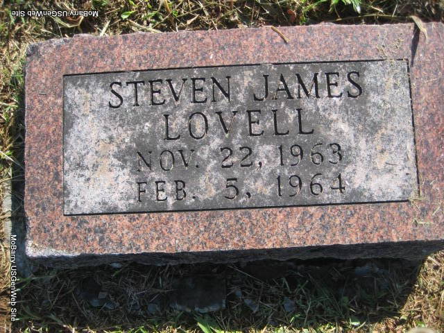 | LOVELL, Steven James | Nov. 22, 1963 | Feb. 5, 1964 | Research Note: Steven James and Larry Joe are buried on the same lot. Probably the son of Louis Lovell and Betty Gates. - Another Photo | Monett Historical Society Photo |