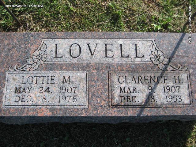 | LOVELL, Lottie Mae (BOLIN) | May 24, 1907 Jenkins, Barry Co., MO |