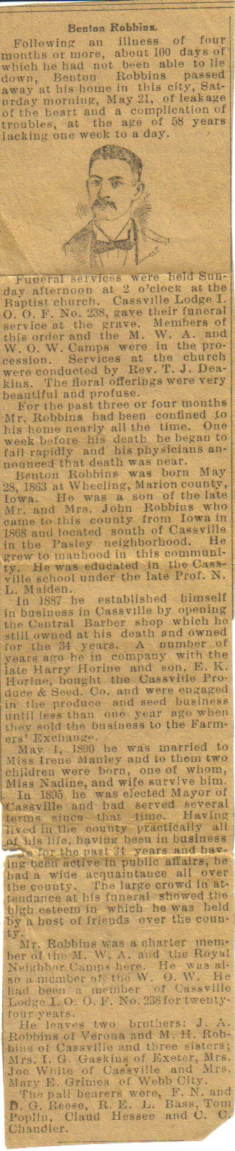 Alford E. W. Benton Robbins (went by Benton), born May 26, 1863, and died May 21, 1921, a son of John Harvey Robbins and Achsah Hobson. Married Irine Manley, May 01, 1890 in Barry Co., MO. OBITUARY: Clipping from unknown Paper Following an illness of four months or more, about 100 days of which he had not been able to lie down, Benton Robbins passed away at his home in this city, Saturday morning, May 21, of leakage of the heart and a complication of troubles, at the age of 58 years lacking one week to a day. Funeral services were held Sunday afternoon at 2 o’clock at the Baptist church. Cassville Lodge I.O.O.F. No. 238, gave their funeral service at the grave. Members of this order and the M. W. A. and W. O. W. Camps were in the procession. Services at the church were conducted by Rev. T. J. Deakins. The floral offerings were very beautiful and profuse. For the past three of four months Mr. Robbins had been confined to his home nearly all the time. One week before his death he began to fail rapidly and his physicians announced that death was near. Benton Robbins was born May 28, 1863 at Wheeling, Marion County, Iowa. He was a son of the late Mr. and Mrs. John Robbins who came to this county from Iowa in 1868 and located south of Cassville in the Pasley neighborhood. He grew to manhood in this community. He was educated in the Cassville School under the late Prof. N. L. Maiden. In 1887 he established himself in business in Cassville by opening the Central Barber shop which he still owned at his death and owned for the 34 years. A number of years ago he in company with the late Harry Horine and son, E. K. Horine, bought the Cassville Produce & Seed Co. and were engaged in the produce and seed business until less than one year ago when they sold the business to the Farmers’ Exchange. May 1, 1890 he was married to Miss. Irene Manley and to them two children were born, one of whom, Miss. Nadine, and wife survive him. In 1895 he was elected Mayor of Cassville and had served several terms since that time. Having lived in the county practically all of his life, having been in business here for the past 34 years and having been active in public affairs, he had a wide acquaintance all over the county. The large crowd in attendance at his funeral showed the high esteem in which he was held by a host of friends over the county. Mr. Robbins was a charter member of the M. W. A. and the Royal Neighbor Camps here. He was also a member of the W. O. W. He had been a member of Cassville Lodge I.O.O.F. No. 238 for twenty-four years. He leaves two brothers; J. A. Robbins of Verona and M. H. Robbins of Cassville and three sisters; Mrs. I. G. Gaskins of Exeter, Mrs. Joe White of Cassville and Mrs. Mary E. Grimes of Webb City. The pall bearers were; F. N. and D. G. Reese, R. E. L. Bass, Tom Poplin, Claud Hesseo and C.C. Chandler. Submitted in 2008 by Norman Smith |