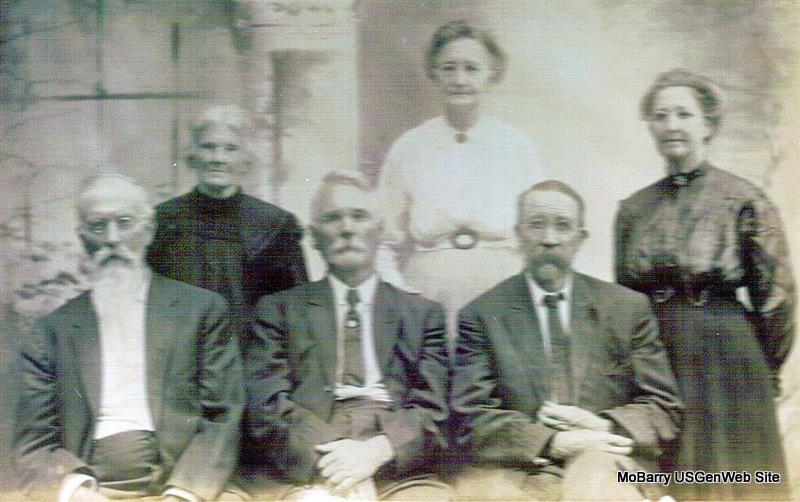 Seated are John Adam Bayless, his brother-in-law James Polk Youngblood, and his brother George M. Bayless. Standing are Rebecca Chaney Bayless (Mrs. John Adam Bayless), Paulina Ann Bayless Youngblood, and Martha Stephens Bayless (Mrs. George M. Bayless). John and Rebecca lived two miles north of Cassville, Paulina and Polk lived near Republic, and George and Martha lived in the Antioch community northwest of Cassville. Other sisters included Nancy Jane Bayless Ferguson (Mrs. William Ferguson) who lived near Butterfield, Sarah M. Bayless Wallace (Mrs. Thomas Jefferson Wallace) who lived near Republic, and Elizabeth Bayless Barnes (Mrs. John Barnes) who died before 1860. Brothers included William A. Bayless who died during the Civil War and who is buried in the Springfield National Cemetery and Hugh P. Bayless who left home to join the army and was never heard from again. Their parents, John Howard Bayless and Lurana Jones Bayless are buried in Vineyard Cemetery northwest of Cassville. Submitted in 2010 by Judy Wilson |