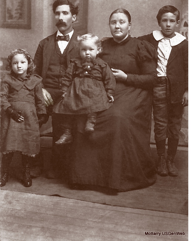Abe Eubanks, Josie (Fare) Eubanks, children are Howie, Alice and not sure on the other. Josie was the daughter of Bill Fare - In the pic I believe (if my dates are correct the children are William Harvey "Howie", Alice and James Earl (in the dress on his mom's lap) and would make it taken about 1897-1899. Sina Josephine "Josie" Eubanks was the daughter of Willam Gardner Fare and Sarah Jane Hughes. She married Abraham Lincoln Eubanks on 30 Jan 1887. He was the son of James Jasper Eubanks and Sophronia Counts. They had children: William Harvey Eubanks, born 1889 in Arkansas, married 1912 to Bessie Mae Montgomery Alice Eubanks, born 1894 in Barry Co. died 1962 in Arkansas?, married to William Alva Sanders James Earl Eubanks, born 1896 Barry Co., died 1947, married Lottie Cox Faye Ruth Eubanks, married Charles M. Swift Ollie Eubanks, born 1905 in Barry Co., married 1928 to Wallace Elwood Scott Wayne Eubanks Myrtle Eubanks married Chris Garrett Submitted by Connie Schmidt |