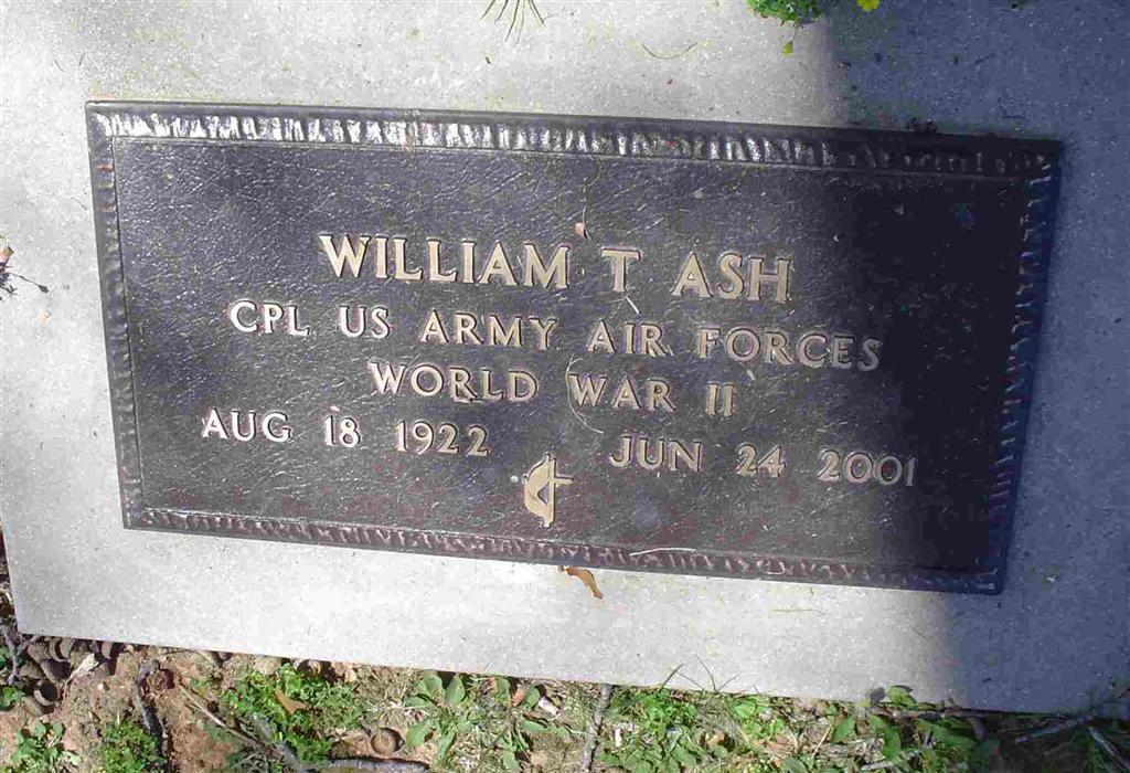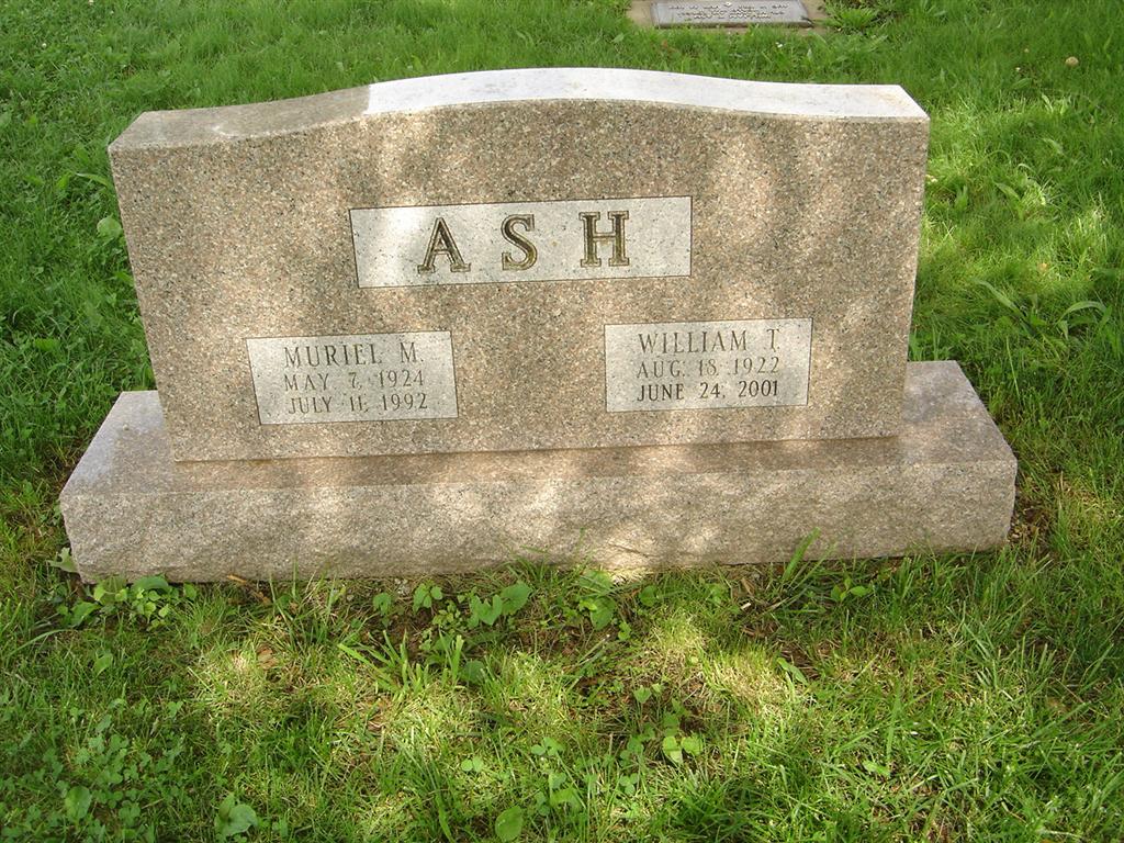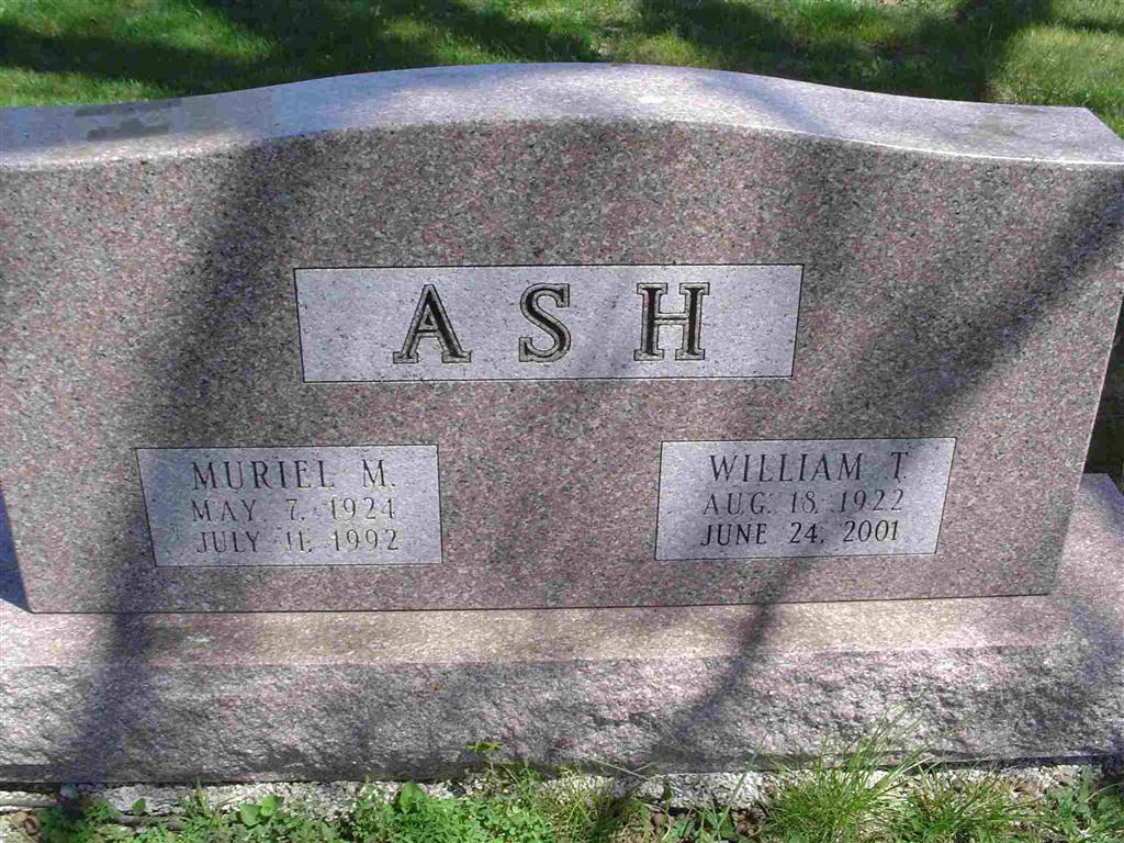 SSW: Muriel M. - Research Note: William T. "Bill" Ash, 78, of Cassville, died June 24 at his home. - Mr. Ash was born August 18, 1922, in Eureka Springs, Arkansas, the son of William Joseph and Ida Wray Ash. He was an Air Force veteran of World War II. He operated canning factories in Washburn, Cassville, Exeter, Ridgley, and Bethpage. He retired in 1985 after being an independent insurance agent for 30 years. He was a member of the United Methodist Church in Cassville, past master of Pythagoras Lodge 383, and a former member of the Cassville Board of Education. He was involved in the youth baseball program and was an assistant Scoutmaster of Troop 76. He was past president of the Cassville Lions Club, a member of the Irwin-Easley Post 118 Cassville American Legion, Tom Wolfe Memorial Post 4207 Monett Veterans of Foreign Wars, past member of the Cassville Zoning and Planning Commission, and served 30 years as a volunteer home service chairman to military families for the American Red Cross. He married Muriel M. McGaughey on November 3, 1946, in Berryville, Arkansas, and she preceded him in death July 11, 1992. Services were 10 a.m. today, June 26, at Fohn Chapel in Cassville with Rev. John Gregory officiating. Burial with military honors were in Oak Hill Cemetery in Cassville under the direction of Fohn Funeral Home of Cassville. - Another Photo - Military Stone - Inscription: "CPL US ARMY AIR FORCES WORLD WAR II" | Monett Times June 26, 2001 Mary Homesley Photo Donna Cooper Photo BCG and HS |