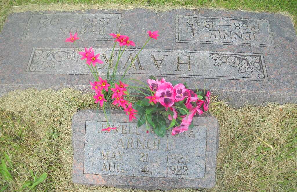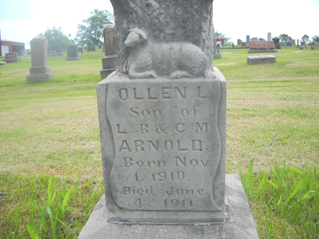 Inscription: "Son of L. B. and C. M." - Research Note: Joan Kunkel reported his stone to read Allen L., but the death certificate has his name as Olan Lavern Arnold. - the stone has it as Ollen. His death certificate states that his father was Lester Benton Arnold, born Exeter, MO, and Cleta Hawk, born Cassville, MO. L. B. and Cleta were married in Barry Co., MO, on Dec. 24, 1909. He is buried next to the Hawk family. | Photo BCG and HS Death Certificate Donna Cooper |