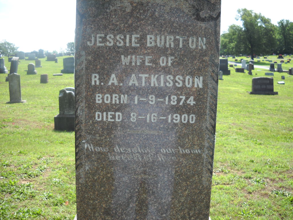 Inscription: "Wife of R. A. Atkisson" - Research Note: Cassville Republican, Thursday, August 23, 1900 - Mrs. Jessie Atkisson, wife of Robert Atkisson, died Thursday morning of last week at the Mayfield sanitarium at St. Louis, where she had been taken a few before her treatment. The deceased was the daughter of Mr. and Mrs. W. T. Burton and was born January 9, 1874. In early life she became a member of the Christian Church and was an energetic worker in the course. A short time after her marriage to Robert Atkisson in 1898, her health began to fail and for the past two years she had been a constant sufferer. Everything known made of science was done for her, but it became evident that her life was slowly ebbing away. Upon consultation it was decided to take her to St. Louis where an operation was performed. AT first the indications were hopeful, but only for a short time. The relapse came and she sank into that sleep that knows no earthly awakening. The remains were brought to Cassville, Friday morning and the funeral services held at 8:30 p.m. the Cassville Band of which the grief stricken husband, was a member, attended the services and escorted the cortege to the church and from there to the cemetery. Rev. Cocharan delivered a beautiful eulogy to the memory of the departed. The deceased was well known and dearly loved. She was an estimable lady of rare attainments. She leaves a husband and little daughter to mourn her loss. - Jessie Stone | Headstone Barbara Carroll Online Obit Phyllis Long Photo BCG and HS |