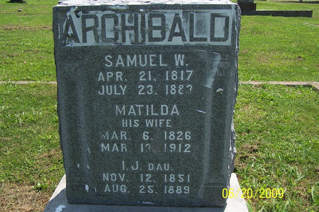 SSW: Samuel W. and I. J. - Inscription: "His Wife" - Research Note: Researchers agree that she was the daughter of John Smith White and Jane C. Alexander. Matilda White married Samuel W. Archibald on Jan. 2, 1844 in Greene Co., AL. When her daughter Margaret Clementine Archibald died in 1910 her parents were given on the death certificate as Samuel Wood Archibald and Matilda White. Fanny Carlin, another daughter was the informant. Margaret was buried in Purdy Cemetery. - Cassville Republican, Thursday, March 21, 1912 - Mrs. Matilda Archibald died Wednesday, March 13, at the home of her daughter, Mrs. Fanny Carlin, in Purdy, of cancer of the face. Mrs. Archibald had suffered for a long time with the trouble which finally ended her life but had bore it all nobly. She was a woman with a remarkable constitution and will power and afflicted as she was she lived to the ripe old age attained by the very few, being eighty-six years and seven days. Funeral services were conducted at the home of her daughter in Purdy, Wednesday by Rev. Knotter of Monett. Her body was brought to Cassville Thursday and buried in Oak Hill Cemetery by the side of her husband, Judge Samuel W. Archibald who died in Cassville in 1893, while serving as judge of the probate court. Mrs. Archibald was the mother of six children, three of whom are living, Scott of Durant, Okla., Frank and Mrs. Fanny Carlin of Purdy. Mrs. Archibald was born in Green County, Ala., March 6, 1826. Was married in 1844 to Samuel W. Archibald. For more than twenty years they lived in Tennessee and from that state came to Missouri locating in Capps Creek township, this county in 1873. In 1882 Mr. Archibald was elected Judge of this probate court and moved to Cassville where he died. Mrs. Archibald moved to Purdy soon after his death and made her home there. For more than seventy years she had been a faithful member of the Presbyterian church and was a most excellent woman, wife and mother and in her death Purdy loses one of its most honored citizens. | Death Certificate Donna Cooper Online Obit AL Marriage Index Phyllis Long Photo BCG and HS |