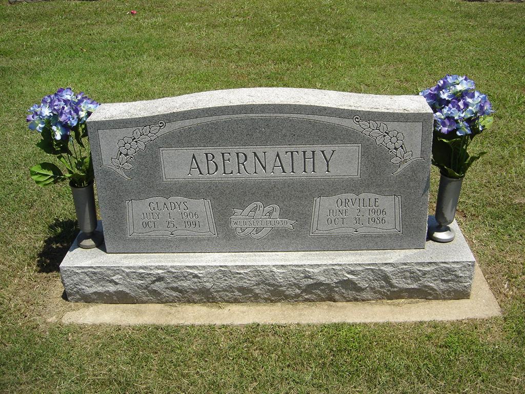 | ABERNATHY, Orville Blackstone | June 2, 1906 | Oct. 31, 1986 | SSW: Gladys - Inscription: "Wed Sept. 13, 1930" - Research Note: Son of Harrison Orville Abernathy and Elizabeth Dora (Haddock) (Abernathy) Means. | Census Phyllis Long Photo BCG and HS |