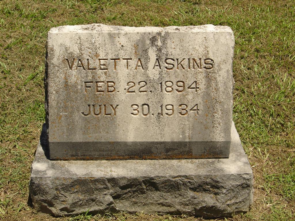 Research Note: Wife of Gordon Clifford Askins. Daughter of Leeander R. Smith and Jennie Steinman, both born IA and buried at Oak Hill Cemetery. Her mother was the informant on the death certificate. - Valetta G. Smith, age 19, first married Stephen Arnold Douglas Armstrong, age 53, on Feb. 12, 1913 in Barry Co., MO. - Kingsport Times, Mar. 30, 1926 - Los Angeles, CA: Elmer E. Odell and Valetta G. Smith, midgets widely known in Circuses and on the screen were married here yesterday. Odell is known as Prince Elmer Odell is three feet tall, while his bride is one inch taller. - Salt Lake Tribune, Sept. 13, 1934 - Circus Romance Ended by Death - Cassville, MO: Burial here of Mrs. Clifford Askins, known in the circus world as "Princess Valetta, world famous midget" ended a marriage believed to be unique in America. The undersized woman, three feet, three inches tall, had been married to a Kansas City cobbler, Clifford Askins, who tipped the beam at six feet, 2 inches. Their romance began under circus tents. She, with a desire to amuse children customers, became a clown. He repaired harness for the horses. A boa constrictor snake, 35 feet long, broke from its cage one day, and made for the Princess. Askins rescued her, saving her life. | Death Certificate Funeral Record Newspapers Phyllis Long Photo BCG and HS |