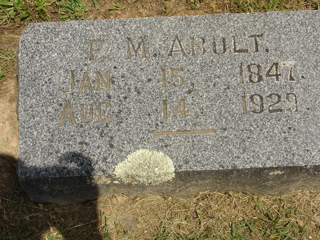 Research Note: Son of Jacob and Vienna (Morgan) Abolt. Vienna's surname first given as Briggs, crossed out, and then Morgan added, born KY. He was a farmer and wife was Mary H. Abolt. N. S. Abolt of Shelby, NE was the informant. - Cassville Democrat, August 16, 1929 - Francis Marion Abolt was born Jan. 15, 1847 at West Lebanon, Ind. and passed away from this life at his home in Cassville, Mo., Aug. 14, 1929 at the age of 82 years, 6 months and 20 days. He was united in marriage with Mary H. Clem of Sheldon, Ill., Jan. 19, 1875. To this union were born three sons. N.S. of Shelby, Neb., Earl, deceased in early childhood, Dr. R.L. of Cassville, Mo. and one daughter Verna Ablot Schroeder of St. Louis, Mo., He also leaves two granddaughters and two grandsons, all of St. Louis. He is survived by his beloved wife, two sons and one daughter, named above. At the age of 75 he was converted and united the United Brethren church of Iola, Kansas. Although his hearing was poor and he was feeble he always enjoyed going to church. He was the youngest of four children and was the last of his family. He was a loving father and husband, kind friend, good neighbor and appreciated by all who knew him. Funeral services were held at the home and conducted by Rev. Green, Wednesday, August 15th at 3 p.m. Interment in Oak Hill | Death Certificate