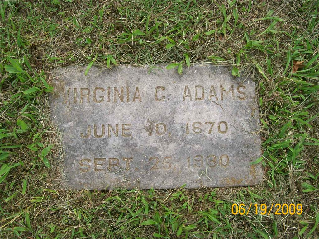 Research Note: Her death certificate reads that she was born June 6, 1870 and not June 10, 1870 as Joan Kunkel reported her birth in the 1982 cemetery transcription of Oak Hill. Her stone reads June 10, 1870. Also it gives Sept. 22, 1930 as her death date and not Sept. 25, 1930 as that transcription reads and as her stone reads. The certificate also reads that she was a daughter of Samuel Huston and his wife Rhonda A. Hancock. - Obituary in the possession of James H. Adams, grandson. - Virginia C. Adams was born in Saline county, Missouri, June 10, 1870, died at her home east of Cassville, September 25, 1930 aged 60 years, 2 months and 15 days of cancer. She was the daughter of Samuel and Rhoda A. (Hancock) Huston. She was married to Harry M. Adams in November 1901, and to them were born six children, five sons and one daughter, two sons and the daughter died at an early age. She is survived by three sons, James Adams of near Cassville, John and Arthur who are in the U. S. Navy. She is also survived by two brothers and one sister, T. E. Huston of Sedalia and S. C. Huston of Exeter, Calif., and Mrs. George Ross of near Cassville. At the age of 16 years she united with the C. P. church, later uniting with the Methodist church of which she was a faithful member until her passing, living a Christian life. Funeral services were held at the home of Mr. and Mrs. George Ross Sunday afternoon, Sept. 29, conducted by Rev. S. R. Dillman, pastor of the Methodist church of Cassville, and internment made in Oak Hill cemetery Cassville, under the direction of the Horine Funeral Service. | Death Certificate Donna Cooper Obit Phyllis Long Photo BCG and HS |