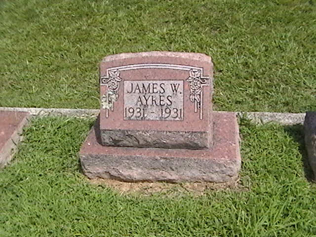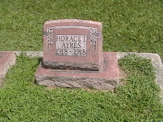 Research Note: Son of Joe H. Ayres and Alma Turner. - Obit - A little bud was transplanted to bloom in a more beautiful climate, there to become a member of the angelic hosts, where sweet hosannahs are sung and happiness and joys are eternal. Horace Turner a little 2 months old babe of Mr. and Mrs. Joe Ayres, died Wednesday at the home of its grandparents Mr. and Mrs. J. P. Turner in this city of stomach trouble, aged 2 months. He was born May ? 1918. Rev E. W. Love of Joplin conducted funeral services at the Turner home at 2 p.m. Thursday ????? which the remains were interred at Oak Hill. - Ayres Plot Stone | Online Obit Phyllis Long Photos BCG and HS |