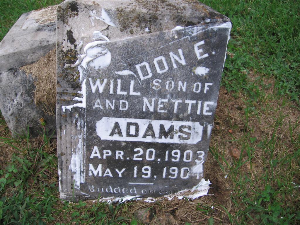 | ADAMS, Don E. | Apr. 20, 1903 | May 19, 1904 | Inscription: "Son of Will and Nettie" - Research Note: Son of William Adams, born Christian Co., MO, and Nettie Hutchens, born Barry Co., MO. This stone is broken in two pieces and the top half is on the ground. | Note Phyllis Long Photo BCG and HS |