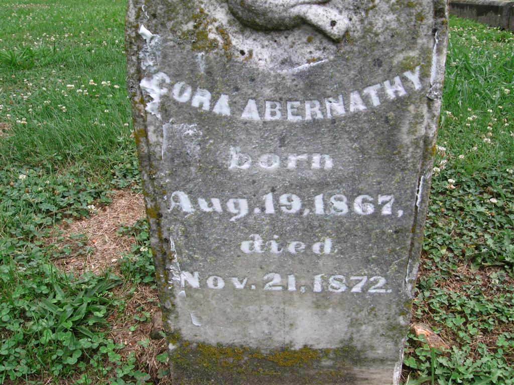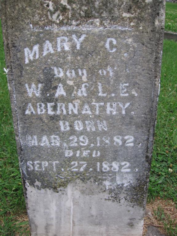 Inscription: "Dau. of W. A. and L. E." - Research Note: She was a daughter of William A. and Laura (Hawk) Abernathy. This family was listed in Barry Co., MO, 1880, but without this child. This stone is next to stones that are two weathered to read. | Note Census Donna Cooper Photo BCG and HS |
