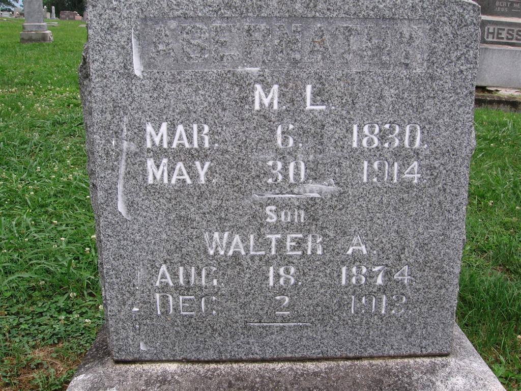 SSW: Marcus L. - Inscription: "Son" - Research Note: Death certificate indexed as Abbernathy. He was a son of Marcus Lee and Nancy J. (Sims) Abernathy. He was single, feeble minded, had a double hernia with other complications of lung. - December 4, 1913, Thursday, Cassville Republican - Dead: Walter Abernathy, son of M. L. Abernathy, died Tuesday evening at the home of his sister, Mrs. J. B. Hesse near town. When three years of age, Walter was stricken with spinal meningitis and bore afflictions from that disease until death. Only a few days ago in company with his father, he returned from a few years' stay with a sister at Sour Lake, Tex. Thursday of last week he became ill from what seemed to be a culmination of his afflictions and was unable to with stand the ravages of disease. Walter was born in this city, August 18, 1874, but owing to his early afflictions his life was confined at the home. Besides a father he is survived by two sisters. They are Mrs. Minnie Drake of Sour Lake, Tex., and Mrs. J. B. Hessee of near town. Funeral services conducted by Rev. E.W. Love, were held at his sister's home Wednesday afternoon and interment made in the Oak Hill Cemetery. | Note Donna Cooper Death Certificate Online Newspapers Phyllis Long Photo BCG and HS |