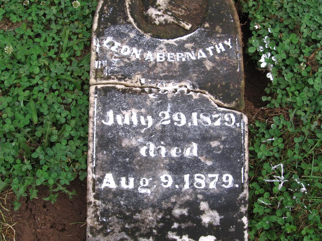Research Note: He was a son of Marcus Lee and Nancy J. (Sims) Abernathy. This stone is broken in two pieces and is off its base. It is flat on the ground. | Photo BCG and HS Note Donna Cooper |