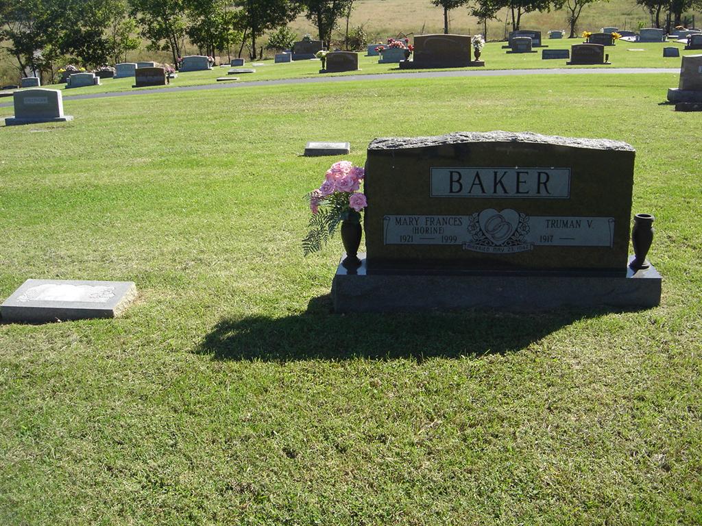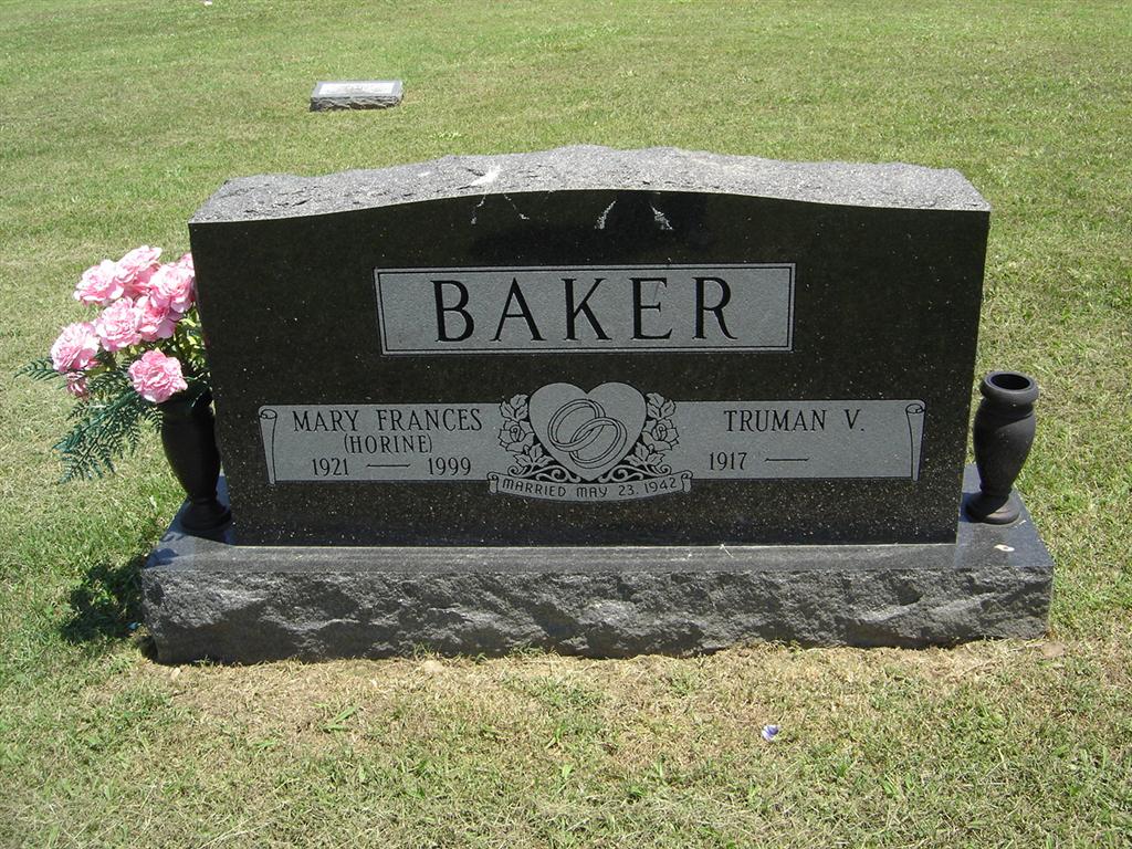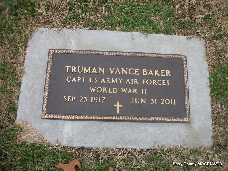 SSW: Mary Frances Horine - Inscription: "Married May 23, 1942" - Research Note: He was a son of Evert Leroy and Mabel Benton (Owings) Baker. On May 23, 1942, he was united in marriage to Mary Frances Horine, who preceded him in death on March 9, 1999. Two daughters were born to this union. On July 9, 1999, he married Phyllis (Hagood) Norman. Truman grew up in the Mineral Springs area and received his education at Cassville, graduating from Cassville High School. He then attended SMS. During World War II he joined the United States Air Force, serving from 1943 until 1947 as a navigator. For a while he owned and operated The Corner Store, where Willis Insurance is now located. In 1957, Truman entered the banking business, remaining a banker until his retirement in 1980 and then became Chairman of the Freedom Bank Board. He developed Sunset Heights in Cassville. He was the instigator of the Cassville Little League Baseball program, coaching the Blues. He had served as President of the Cassville Chamber of Commerce. He was a member of Church of Christ in Cassville. He started the first sand greens golf course in Cassville and was instrumental in building the present Cassville Golf Course. He was a long-time member of the Cassville Rotary Club and was the oldest Rotarian in Barry County. He is a Paul Harris Fellow. - Another Photo - Another Photo - Military Stone - Inscription: "CAPT US ARMY AIR FORCES WW II" | Cassville Democrat Phyllis Long Photos Diana Cope Note Donna Cooper Photo BCG and HS |
