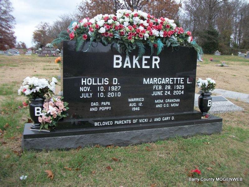July 10, 2010 | SSW: Margaretta L. - Inscription: "Married Aug. 12, 1946" - Research Note: He was a son of Lela Dilbeck and Charley Baker in Cassville. He was united in marriage on August 12, 1946, to Margaretta Smith, who preceded him in death on June 24, 2004. He is also preceded in death by his parents and his grandson, Mason Baker. WW II Paratrooper, retired owner and developer of medical manufacturing company, retired Boeing executive. Burial with military honors will be in Oak Hill Cemetery, MO. - Another Photo - Another Photo | Buchanan Funeral Home Phyllis Long Photo Donna Cooper Photo BCG and HS Photo Diana Cope |