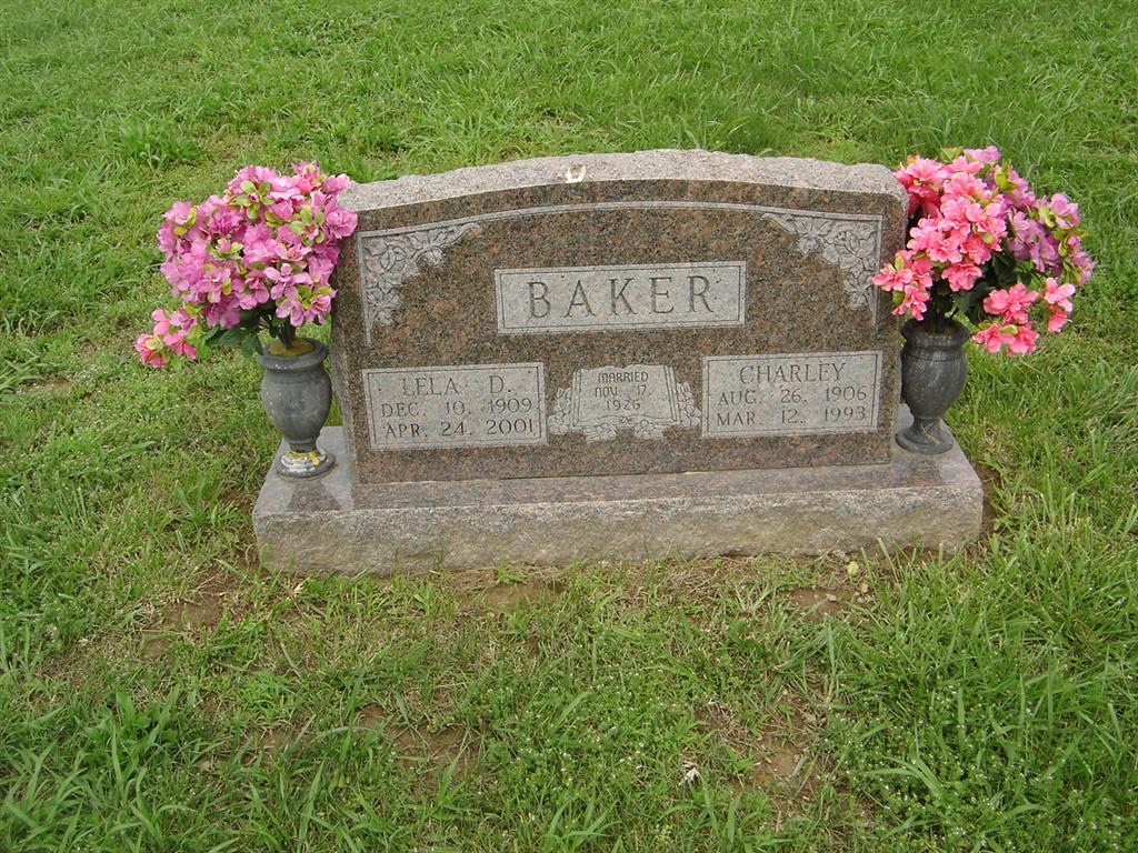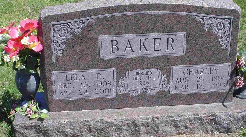 SSW: Charley - Inscription: "Married Nov. 17, 1926" - Research Note: Daughter of William Franklin and Josephine (Box) Dilbeck, married Charley Baker on November 17, 1926, and he preceded her in death March 12, 1993. She moved to Wichita, Kansas, in 1950, and worked as a blueprint machine operator for Coleman Company for 20 years before retiring. Survivors include one son, two grandchildren, five great grandchildren and one great great grandchild. She was preceded in death by two brothers and four sisters. - Another Photo | Monett Times April 25, 2001 Mary Homesley Photo Donna Cooper Photo BCG and HS |
