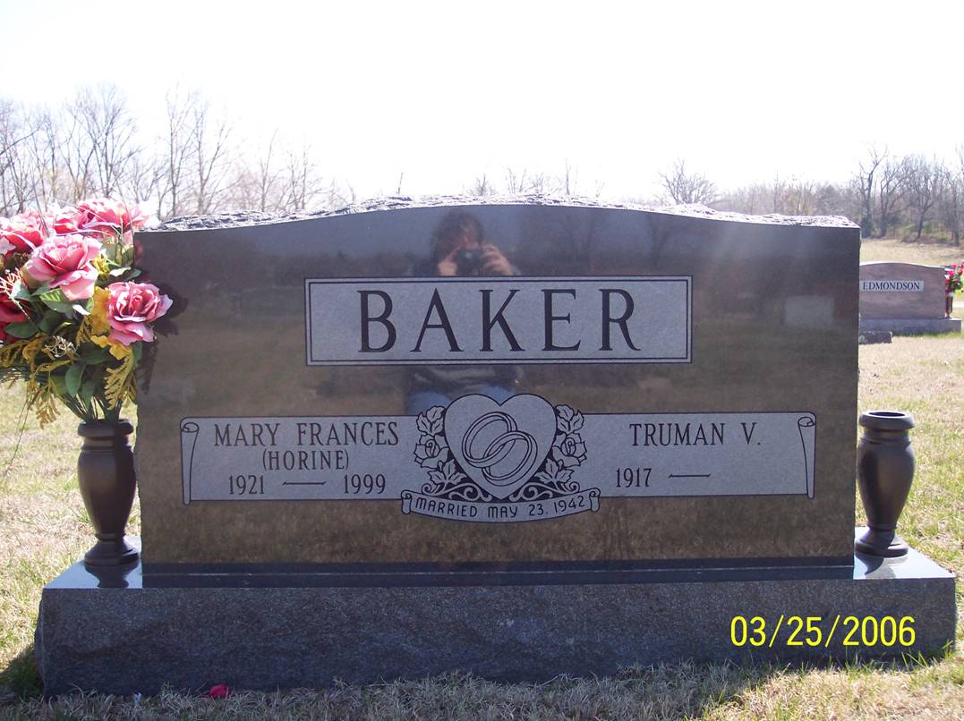 SSW: Truman Baker - Inscription: "Married May 23, 1942" - Research Note: She was a daughter of Glenn Michael and Martha Esther (Cope) Horine. - Another Photo - Another Photo - Another Photo | Headstone Kay Baker Cardin Photos Diana Cope Note Donna Cooper Photos BCG and HS |