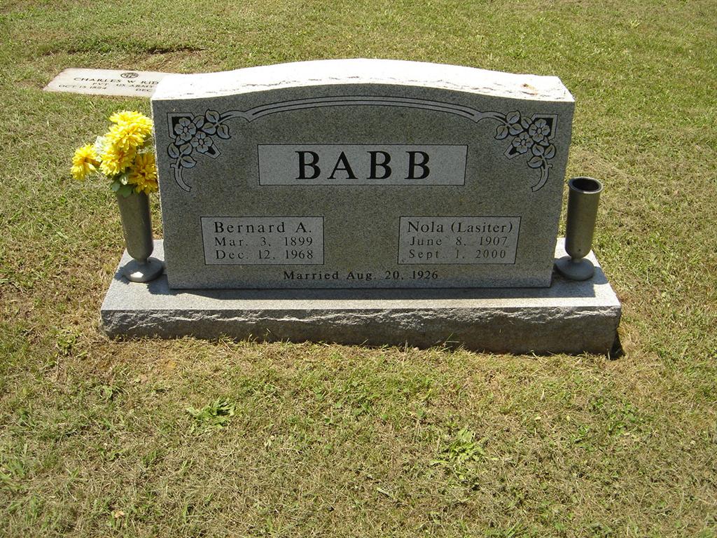| BABB, Nola (LASITER) | June 8, 1907 | Sept. 1, 2000 | SSW: Bernard - Research Note: Daughter of Otis Logan Lasiter and Bertha Ann Hilton. Nola Lasiter married Bernard Babb on Aug. 20, 1926 in Webb City, Jasper Co., MO. | Census MO Marriage Records Phyllis Long Photo BCG and HS |