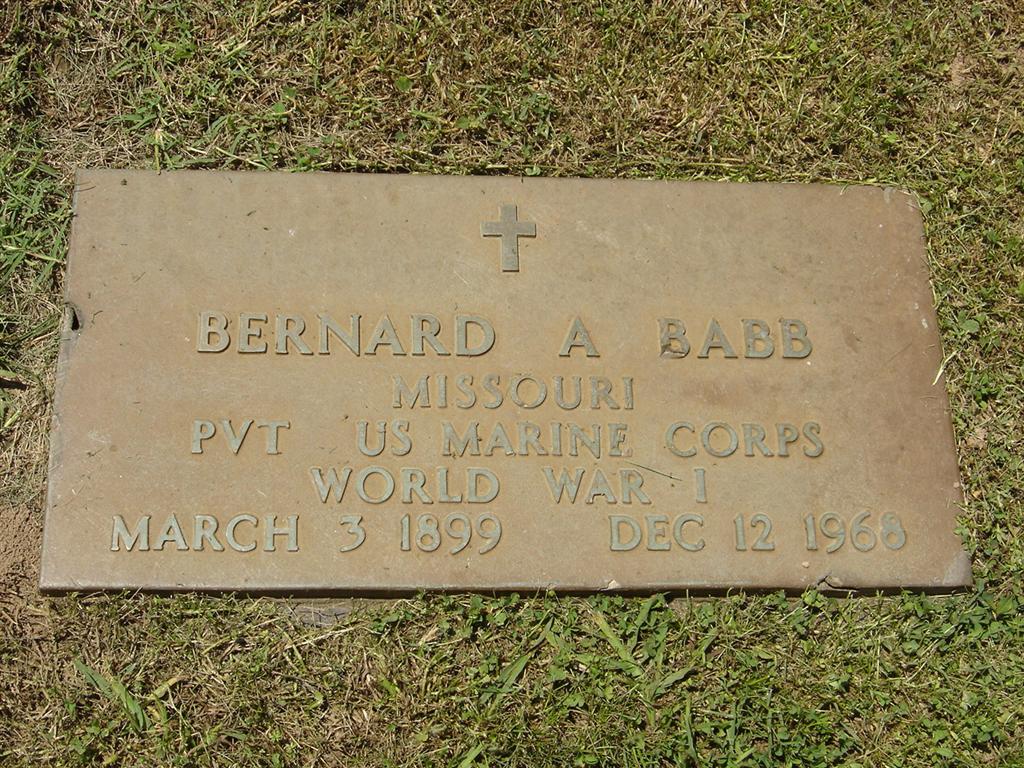 SSW: Nola Lasiter - Inscription: "Married Aug. 20, 1926" - Research Note: According to the Culver Funeral Home records, published by Ted Roller, Bernard Allen Babb was a son of Marion Bascom Babb and his wife Ella Jane Smith. He died from the effects of pneumonia in the VA Hospital in Fayetteville, AR, and had lived in the Cassville area all of his life. He was a law officer and his wife was named Nola (Lasiter) Babb. He lived at 1106 Fair St., Cassville, MO and was 69 years old at the time of his death. - December 22, 1917, Saturday, Cassville Democrat - Bascom Babb of this city received a letter from his son Bernard, who is in France, having gone over with first expedition Monday and said he was all right. That they were drilling very well. - Cassville Republican, Thursday, February 6, 1919 - M. B. Babb received a letter Friday from his son, Bernard, saying that he was in Germany with the army of occupation. He wrote that John Babb is still in France. - Cassville Republican, Aug. 7, 1919 - Mr. and Mrs. M. B. Babb received a telegram Tuesday from their son, Bernard, saying that he had landed safely in New York. Bernard and his brother, John, are in the Marines, having voluntarily enlisted in the spring 1917. They were at Chateau Thierry, Bellevue Woods and on the Meuse-Argonne drives, the hardest fought battles of the world war. - Military Stone - Inscription: "MISSOURI PVT US MARINE CORPS WORLD WAR I" | Culver Funeral Home, by Ted Roller Donna Cooper Online Newspapers Phyllis Long Photo BCG and HS |