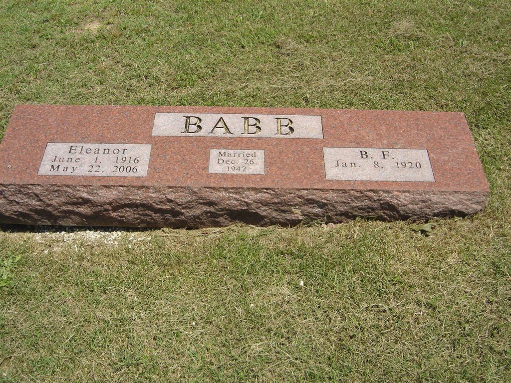 SSW: Eleanor - Inscription: "Married Dec. 26, 1942" - Research Note: He was born in 1920, in a farmhouse just about a mile from Washburn, Missouri. His parents were Zoe (Windes) Babb and Emmett Babb. His father died when he was seven, and the family home burned down when he was about twelve. B. F. graduated from high school in Washburn, and attended college for two years in Springfield and Dodge City. He taught school for a year at the old Quaker School House before going to work for Boeing in Wichita. There he met and married Eleanor Tyrrell in 1942, and was inducted into the Marine Corps in 1943. He made beach landings under fire in the Pacific Theater at Tarawa, Saipan, Tinian and Okinawa. At the conclusion of the war, all of his and Eleanor's possessions burned in a warehouse fire in Wichita. He returned to Barry County, where he and Eleanor started from scratch and began a family. B. F. and his sister owned the old Cassville Truck Line until 1960. He was preceded in death by his wife of sixty-three years; his sister, Maxine Hailey and his brother, Gus Babb. | Fohn Funeral Home Phyllis Long Photo BCG and HS |