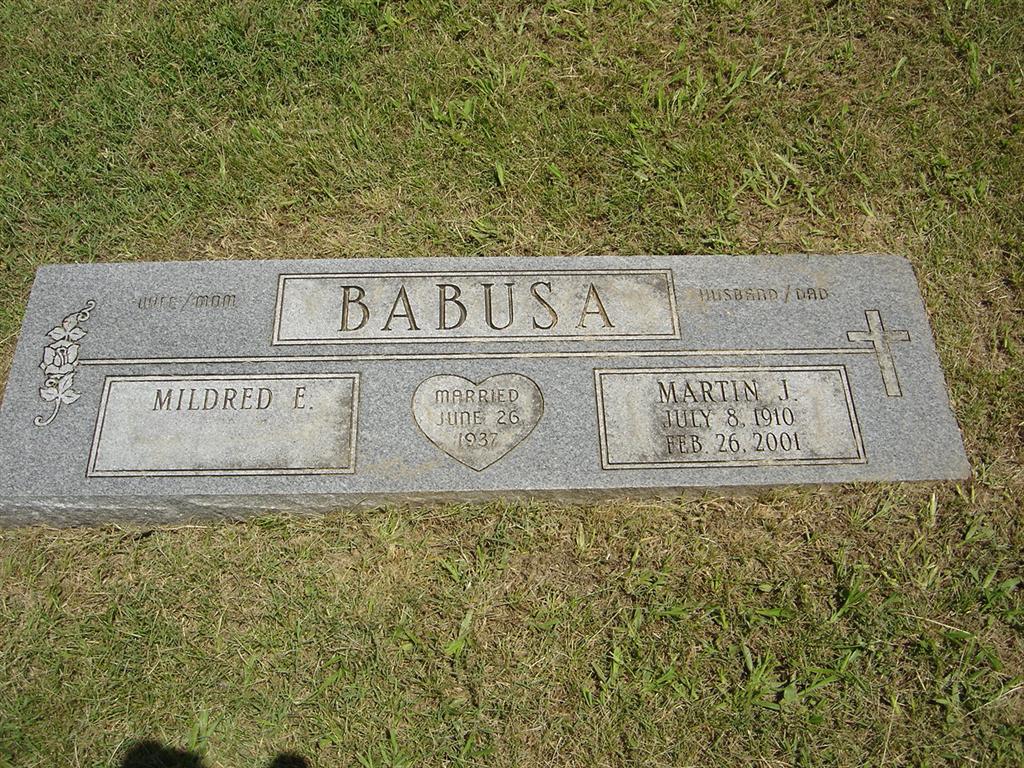 SSW: Mildred E. - Inscription: "Married June 26, 1937" - Research Note: Martin James Babusa, 90, of Cassville, died at 10:30 p.m. February 26 at South Barry County Hospital in Cassville. Mr. Babusa was a retired certified safety professional. Services will be 10 a.m. tomorrow, March 2, at St. Edwards Catholic Church in Cassville. - Son of Stephen and Maria Babusa. He was made a US Citizen on July 29, 1941 in the District Court at Chicago, IL. He arrived in New York, NY on the ship Carpathia, on Oct. 17, 1912, age 2. Marriage License to Mildred Dawson was applied for on May 22, 1937 in Chicago, Cook Co., IL. | Monett Times March 1, 2001 Mary Homesley Mar. 1, 2001 Monett Times Naturalization Records Census Phyllis Long Photo BCG and HS |