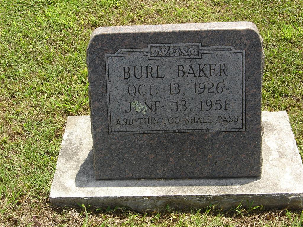 Inscription: "And This Too Shall Pass" - Research Note: Son of William Truman Baker and Edna M. McClure. Killed in the Korean War. Kellis Burl Baker, age 20, married Lila Evelyn Thomas, age 22, on May 27, 1947 in Jackson Co., MO. W. T. Baker, father of Kellis, gave consent. Lila applied for his military stone. Second Lieutenant Baker was a member of the 5th Cavalry Regiment, 1st Cavalry Division and was Killed in Action while fighting the enemy in North Korea. He was awarded the Purple Heart, the Combat Infantryman's Badge, the Korean Service Medal, the United Nations Service Medal, the National Defense Service Medal and the Korean War Service Medal. There is a military stone at findagrave.com naming him Kellis B. Inscription: "MISSOURI, 2d LT, 85 Infantry, WW II, Korea PH" | Census MO Marriage Records Phyllis Long Photo BCG and HS |