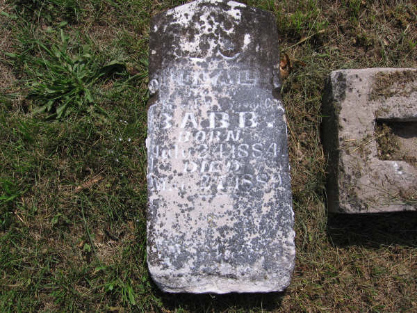 | BABB, Vona | 1887 | 1888 | Inscription: "Dau. of Joseph and Susan" - Research Note: This stone is no longer readable. Information was taken from the 1982 transcription of the cemetery book done by Joan Kunkel. | Photo BCG and HS |