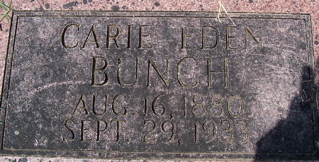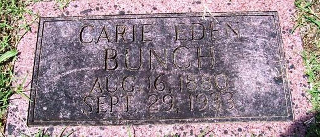 | BUNCH, Carrie (EDEN) | Aug. 16, 1880 | Sept. 29, 1933 | Research Note: Daughter of James Jefferson Edens and Mary Elizabeth Hutchings, both buried at Oak Hill Cemetery. - Another Photo - Another Photo | Census Phyllis Long Photos LoVella Truhitte Moore Photo BCG and HS |