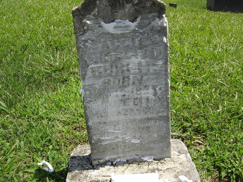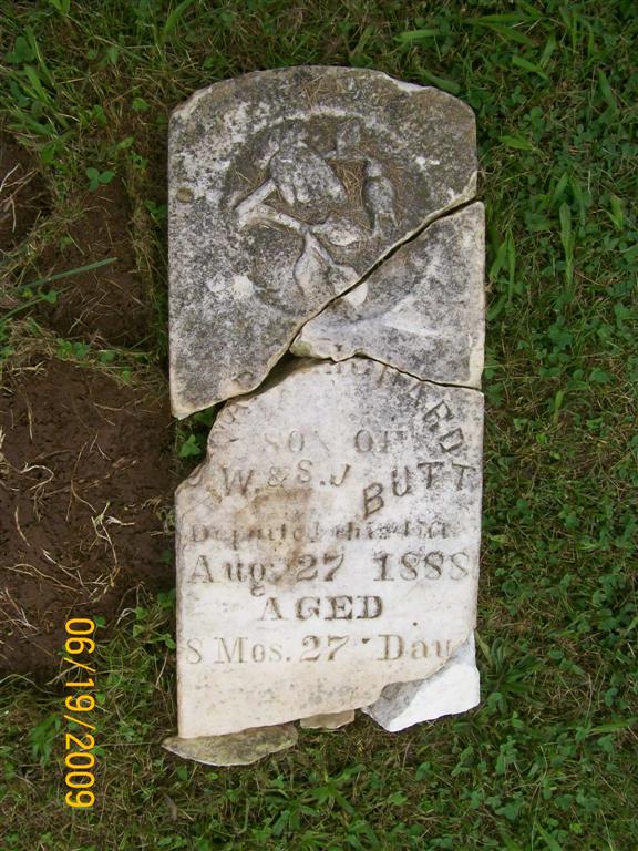 | BUTT, Ward Richard | Jan. 1, 1888 | Aug. 27, 1888 | Inscription: "Aged 8 Mos. 27 Days, Son of J. W. and S. J. Butt" - Research Note: This stone is broken in at least 3 pieces and is flat on the ground. | Photo BCG and HS |