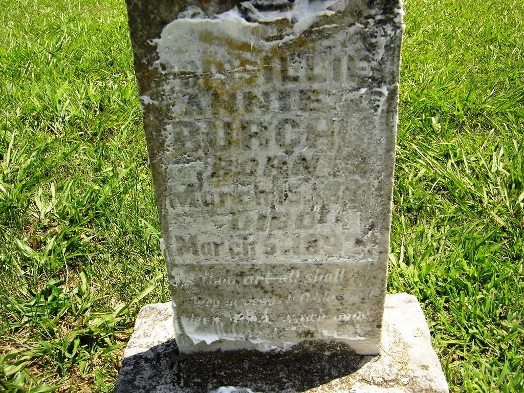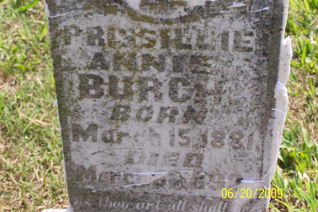 Research Note: Cassville Republican, Thursday, March 10, 1892 - Died Saturday, March 5th, 1892, Priscilla Ann, daughter of Willard and Martha F. Burch, aged 10 years, 11 months, 20 days. After an extended illness she sleeps to wake no more on earth. The remains were interred Sunday to the Cassville Cemetery. - Another Photo - Another Photo | Online Newspapers Phyllis Long Photos BCG and HS |