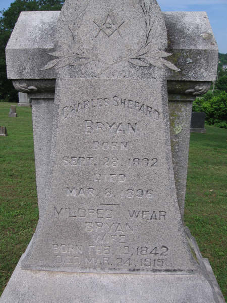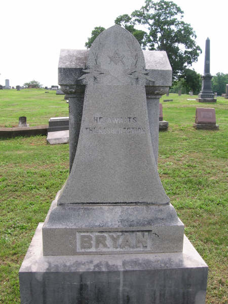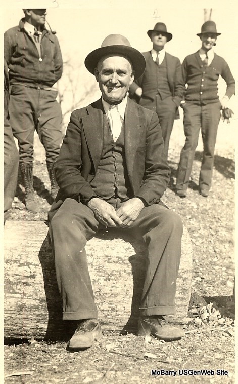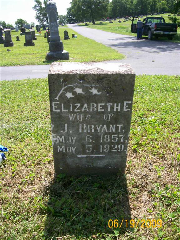 Research Note: His death certificate reads that his wife was named Elizabeth Hadley. His parents were not known. Ray Bryant of Cassville, MO was the informant. Son of John Conrad Bryant and Rebecca J. Clevenger. - Cassville Republican, Sept. 11, 1930 - John W. Bryant Dies: John W. Bryant, a well know citizen of Cassville and surrounding communities, passed away at his come Friday morning at the age of 76 years, after an illness of a few weeks. He was born in Illinois in 1854, and moved to Richland, MO, with his parents when a boy. Remaining there for some time he came to Barry county and in 1873 he and Miss Elizabeth Hadley were united in marriage and to this union seven children were born, all living. They are; Mrs. Bert McFarlin who resides in Kansas, Mrs. Doyle Simmons of Idaho, Mrs. Ora Chaney of Kansas, Mrs. Stella Black, Chas G. Bryant, Ray Bryant of Cassville and Wm. R. Bryant of Purdy. Mrs. Bryant passed away about 16 months ago. After his marriage he farmed a few years northwest of Cassville, moving to town in about 1889 and for years was in the drying business. He was a man of jovial disposition, and the gift of imitation which he used in his younger days much to the amusement of his friends and sometimes to their embarrassment. Although in his youth he did not have the advantages of school, he was a keen observer and a sound reasoner, was witty and made friends easily. Funeral services were held at the residence Saturday afternoon, Sept. 6, conducted by Rev. C. E. Henderson and interment was made in Oak Hill cemetery under the direction of W.D. Koon. Soon after the death of his wife he began failing and gradually declined in health, being forced to take his bed a few weeks ago. - Donna's Note: The stone has 1855 and not 1854 as the death certificate has. | Death Certificate Census Online Obit Phyllis Long Photo BCG and HS |