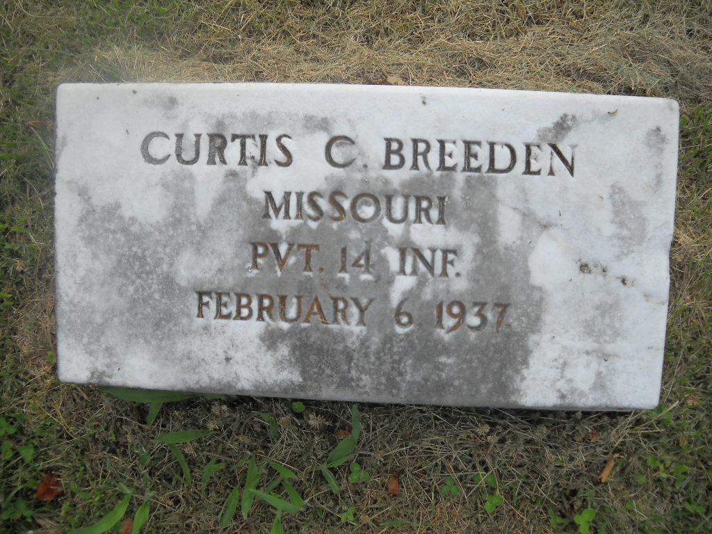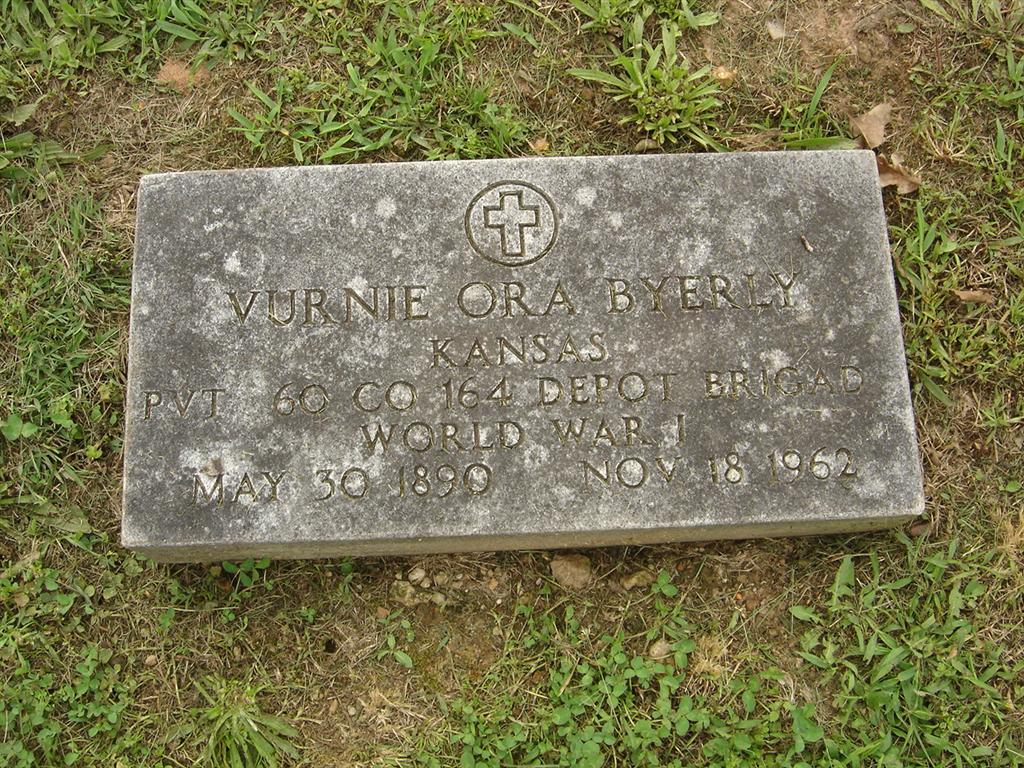 Inscription: "KANSAS PVT 60 CO 164 DEPOT BRIGAD - WORLD WAR I" - Research Note: Culver Funeral Home records read that he was married and that Mrs. Faye Byerly of Jenkins, MO, was his wife's name. Henry Byerly was his father and Hattie Gibbs was his mother. - Son of Henry Clay Byerly and Hattie R. Roland. Gibbs probably a second marriage for his mother. He first married Bertha A. Pease. Second married Faye Luella Benham. Faye ordered his military stone. | Photo BCG and HS Culver Funeral Home, V. 10, P. 55, by Ted Roller Donna Cooper Census Military Headstones Phyllis Long |