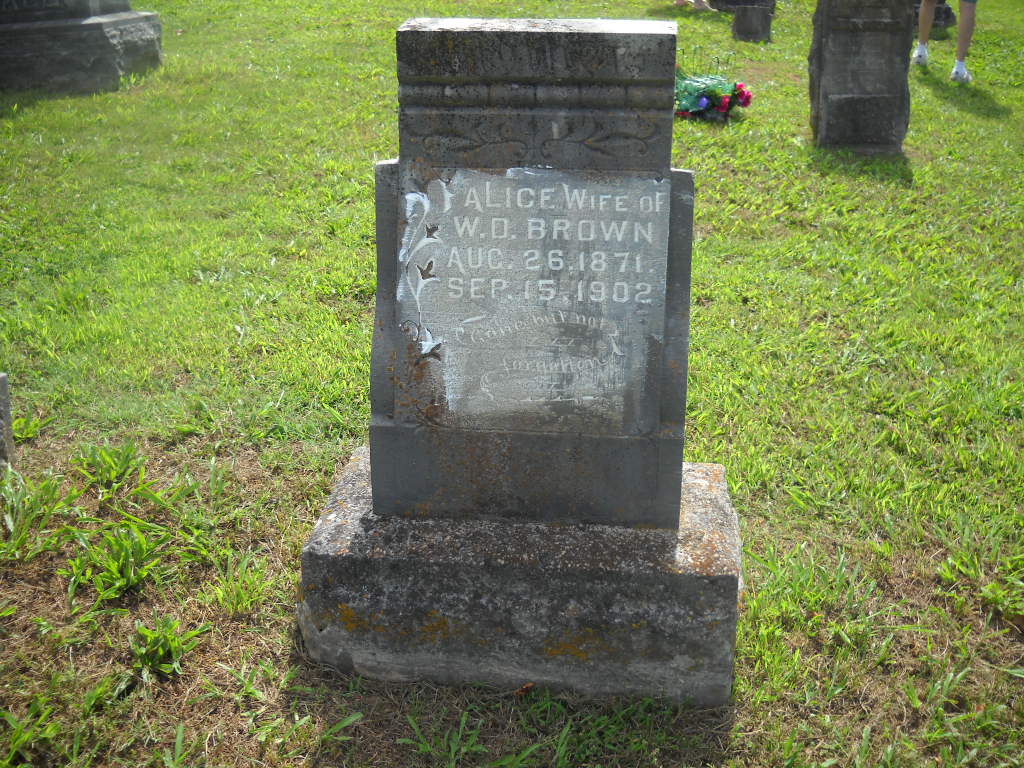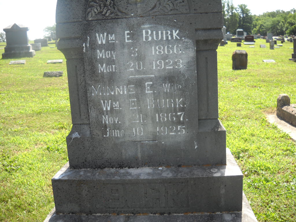 SSW: William E. - Inscription: "Wife" - Research Note: Her death certificate reads that her husband's name was Epsey Burk. She was a daughter of Henderson Brown, born MO, and Mary Donnell, born IL. The cause of death was apoplexy. She was widowed and age 57 years, 6 months and 13 days old when she died. Wm. D. Brown, Cassville, MO, was the informant. | Photo BCG and HS Death Certificate Donna Cooper |