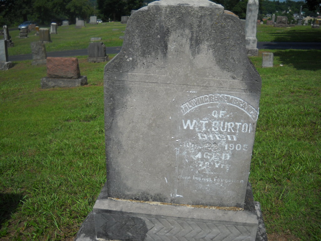 | BURTON, William Thompson | Apr. 1835 | Aug. 22, 1905 | Inscription: "Aged 72 Years" - Research Note: Civil War Veteran. Son of John O. and Mary A. Burton. His wife was Mary Ellen Townsend. - July 9, 1896, Cassville Republican, Thursday - William T. Burton is the oldest native born resident being born to Mr. and Mrs. John O. Burton, April 1835. - July 9, 1896, Cassville Republican - Uncle Jack Stephens an octogenarian of north of Exeter was in the Confederate services under Lieut. Wm T. Burton. - April 15, 1905, Saturday, Cassville Democrat - W. T. Burton and family moved their residence in this city, Tuesday, from his farm north of Exeter. - September 30, 1905, Saturday, Cassville Democrat - In Memoriam: We your committee appointed to draft resolutions in memory of Bro. W. T. Burton, beg leave to report as follows: Whereas, Almighty God, in the ___ of his Divine will has removed from our midst our esteemed as a well tried and faithful member of this lodge: Therefore be it. Resolved, That Lillian Rebekah Lodge No. 26. I. O. O. F., by the death of Brother Burton, has lost one of its best members, and though we feel keenly the loss of our brother from our earthly ranks, yet we know he shines more brightly in that celestial order in the land of our sunshine and happiness. Resolved, That to his sorrowing wife who is bereft of his loving care and his children who have lost their best friend and sweetest guide, we offer out sincerest sympathy and the consolations of Him who has promised to be a stay to the widow and fatherless. Resolved. That these resolutions be spread upon the minutes of this lodge; that a copy be sent to the family of our departed brother and that each of our city papers, be furnished with a copy for publication. Della Parrish, Sarah Galloway, Alta Goodnight - Committee. - September 1, 1906, Saturday, Cassville Democrat - A. Long has bought Ewing Hawk's residence in Townsend's addition, known as the W. T. Burton residence this week. - Cassville Republican, Thursday, June 20, 1918 - Soldiers Buried in Oak Hill Cemetery: Confederates, W. T. Burton. | Online Newspapers Phyllis Long Photo BCG and HS |