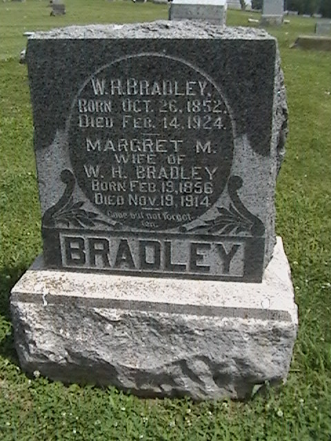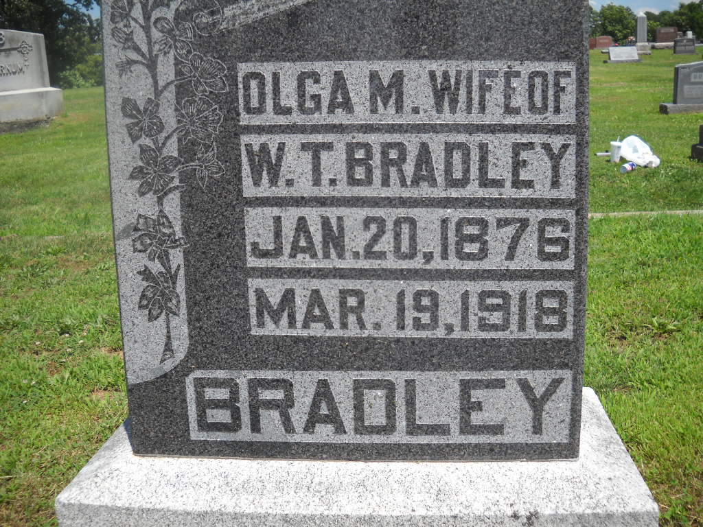 Inscription: "Wife of W. T. Bradley" - Research Note: Daughter of John G. Grissom and Celenda (McCoy) Morray. Olga M. Grissom married William T. Bradley on Oct. 4, 1893 in Johnson Co., IL. - Cassville Republican, March 21, 1918 - Mrs. C. H. Hadley received a telegram Tuesday from Marion, Ill., requesting her to have arrangements made for the funeral of Mrs. Olga Bradley, wife of W. T. Bradley, in this city, Thursday. The Bradley family lived for a number of years east of Cassville and are well known here. They moved to Marion, Ill., a few years ago. Mrs. Bradley's body is being brought back here for interment. The funeral will be held at the Baptist Church Thursday afternoon. Rev. J. W. Ennes will conduct the funeral services. - Cassville Republican, March 28, 1918 - The funeral of Mrs. W. T. Bradley was held at the Baptist Church in this city Thursday afternoon at 2:30 o'clock, conducted by Rev. J. W. Ennes. Her body had been sent here from Marion, Ill., for burial beside her little daughter who died several years ago when the family lived east of Cassville. A number of the former neighbors and friends of the family east of town attended the funeral. Olga M. Grissom was born Jan. 20, 1876 near Simpson, Ill. She was united in marriage to W. T. Bradley Oct. 4, 1895. To them two daughters were born one of whom Miss Eulaie, aged 19, is living. The family moved back to Illinois a short time after the death of their little daughter. The deep grief caused by her daughter's death undermined her health which ended in a nervous breakdown. She had been a faithful member of the Baptist church for many years and during their residence near this city had made a host of friends who held her in the highest esteem. | Online Obit IL Marriage Index IL Death Index Phyllis Long Photo BCG and HS |