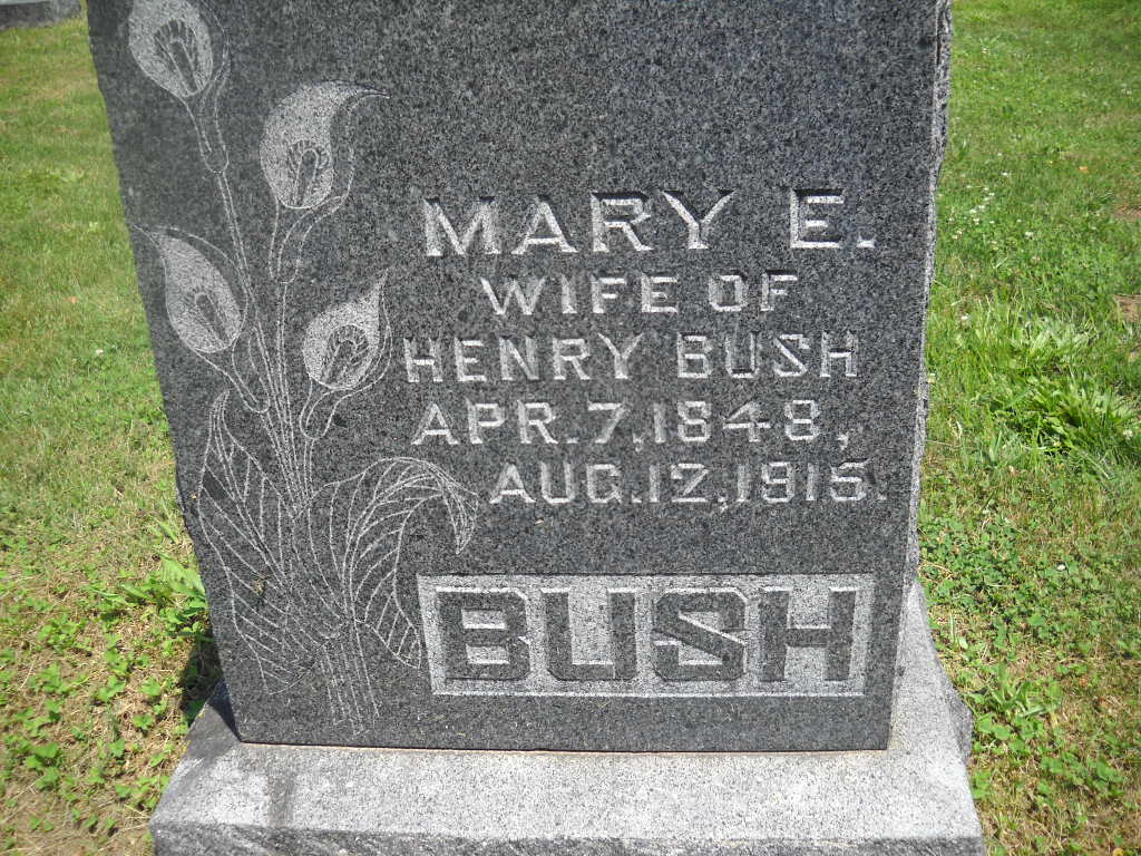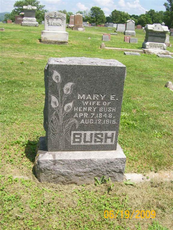 Inscription: "Wife of Henry Bush" - Research Note: Mary Elizabeth Porter married Henry M. Bush on Feb. 9, 1887 in Burlington, Des Moines, IA. Daughter of Thompson Porter and Sarah Abbott. Henry was the son of Christopher Bush and Elizabeth Miner. Henry died Mar. 30, 1933 at the Hollingsworth Hotel in Texarkana, Bowie Co., TX. Born Feb. 16, 1843 IN at age 90. Elizabeth Johnson of San Bernito, TX was the informant on the death certificate. - Cassville Republican, August 19, 1915, Thursday - Funeral Sunday at M. E. Church: The funeral of Mrs. Henry Bush of Rogers, Ark., was held at the M. E. Church in this city, Sunday, conducted by the pastor, Rev. T. M. Hickman. Mrs. Bush had been an invalid for some time. She was 67, was born in Iowa. The family had lived at Rogers about four years. She was a sister of Mrs. G. W. Renz and of Miss America Porter, south of Cassville, excellent citizens who have moved to this county during the past few years. Their many friends extend sympathy in their bereavement. Interment was made in Oak Hill Cemetery. - Another Photo | Online Obit IA Marriage Index TX Death Certificate Phyllis Long Photos BCG and HS |