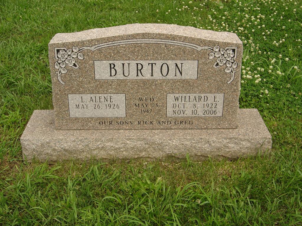 SSW: Willard E. - Inscription: "Wed May 25, 1947" - Research Note: She was the daughter of Albert and Mary (Fogg) Church. On May 25, 1947, she was united in marriage to Willard E. Burton, who preceded her in death on November 10, 2006, following fifty-nine years of marriage. She was also preceded in death by her parents. Alene graduated from Cassville High School and continued her education at Draughon's Business College in Springfield, Missouri. She was a bank teller at Commerce Bank in Cassville (formerly Barry County Bank) for many years. | Fohn Funeral Home Phyllis Long Photos BCG and HS |