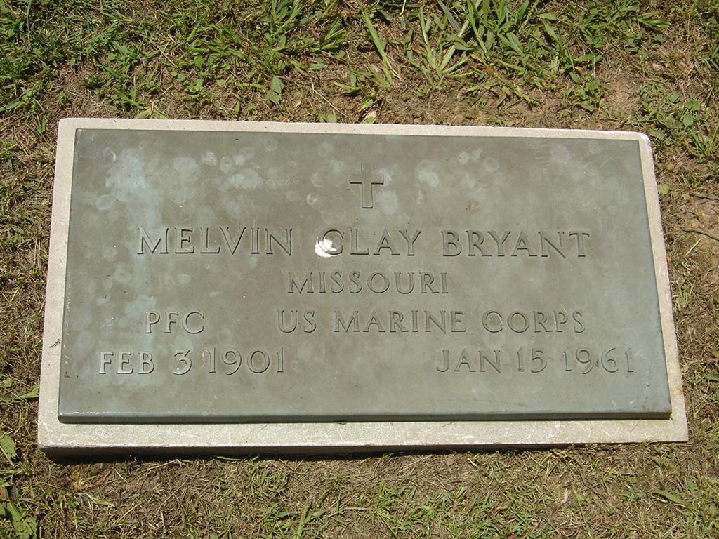 SSW: Mary Malissa - Research Note: Culver's Funeral Home Records, published by Ted Roller, state that his father was Henry Bryant and that his mother was Alice Weddington. He was married and Mary (Bolton) Bryant was given as his wife's name. He was a well driller by occupation. - Military Stone - Inscription: "MISSOURI PFC US MARINE CORPS" | Culver Funeral Home, V. 9, p. 77, Ted Roller Donna Cooper Photos BCG and HS |