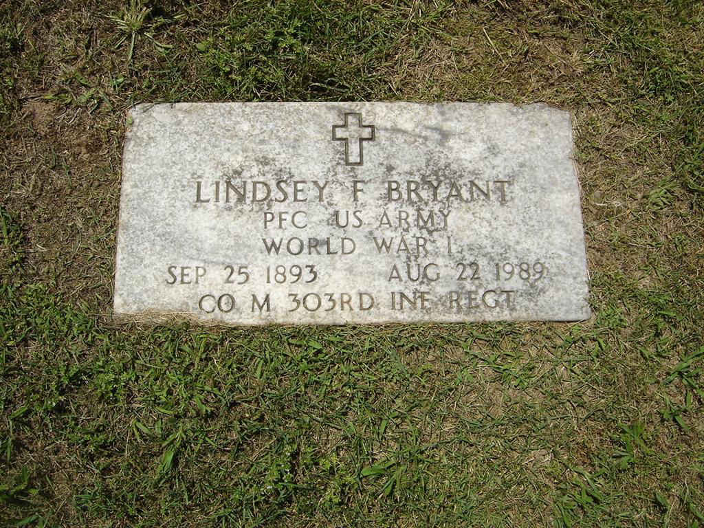 | BRYANT, Lindsey F. | Sept. 25, 1893 | Aug. 22, 1989 | Inscription: "PFC US ARMY WORLD WAR I - CO M 303RD INF REGT" - Research Note: Son of Henry Clay Bryant and Alice Grace Weddington. Lindsey Bryant, age 27, married Mary Hoagland, age 23, on June 29, 1921 in Carroll Co., AR. - Cassville Republican Oct. 16, 1919 - Lindsey Bryant of Golden and Samuel Brock of Mano arrived in Cassville Tuesday morning from France, having received their honorable discharges from the military service. Both of them are looking fine and were getting very anxious to get home. - Photo of double stone at findagrave.com. SSW: Mary Frances. | Online Newspapers Census AR Marriage Index Phyllis Long Photo BCG and HS |