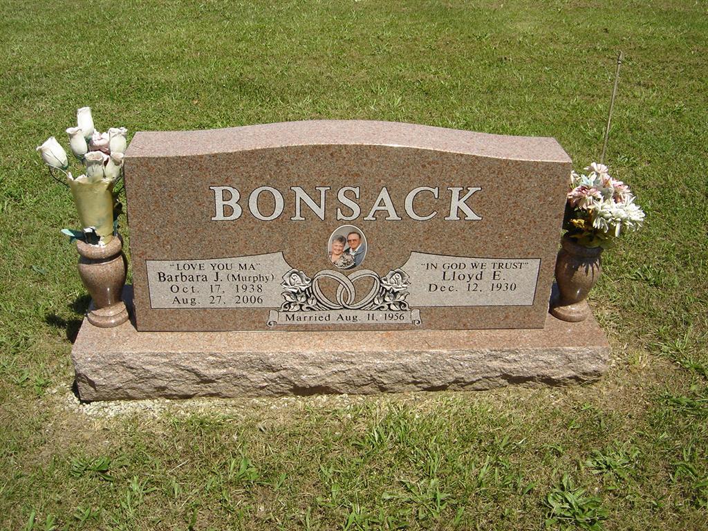 SSW: Barbara J. Murphy - Inscription: "Married Aug. 11, 1956" - Research Note: He was the son of Lloyd Bonsack, Sr. and Lina (Lang) Bonsack. On August 11, 1956, he was united in marriage to Barbara Murphy, who preceded him in death on August 27, 2006. Also preceding him in death were his parents and one sister. Lloyd received his education in Wisconsin. He served in the United States Army. For several years he resided in Auburn, Indiana, where he was a warehouse supervisor for a box company. He was a member of Purdy First Baptist Church. | Fohn Funeral Home Phyllis Long Photo BCG and HS |