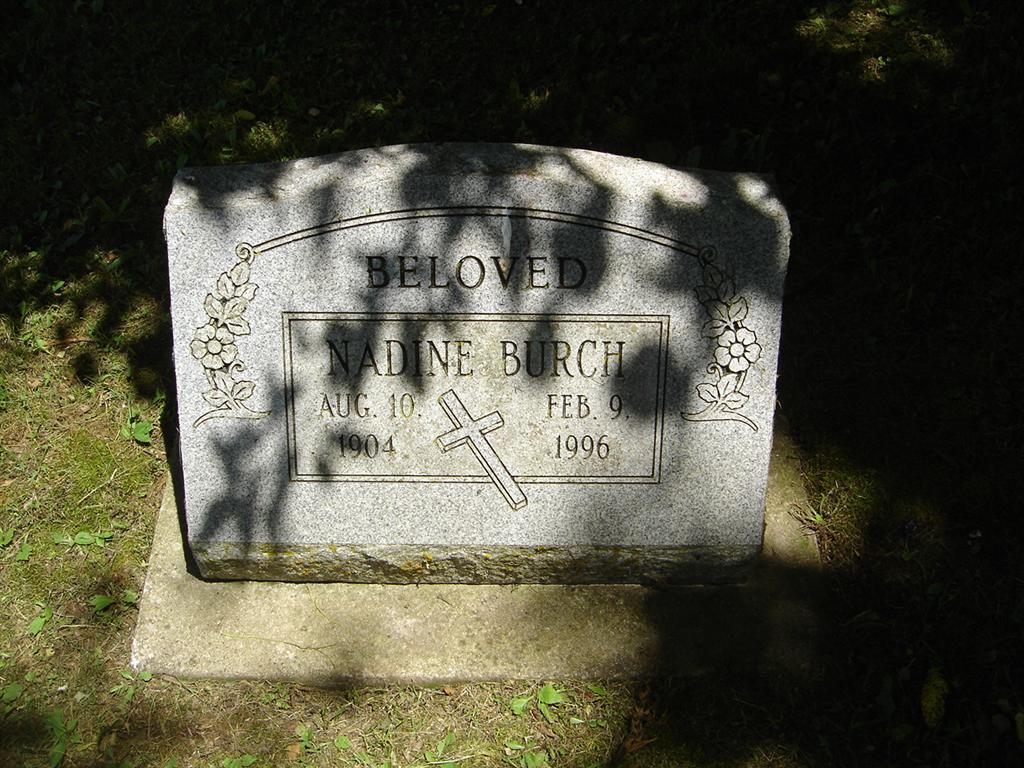 | BURCH, Nadine | Aug. 10, 1904 | Feb. 9, 1996 | Inscription: "Beloved" | Photo BCG and HS |