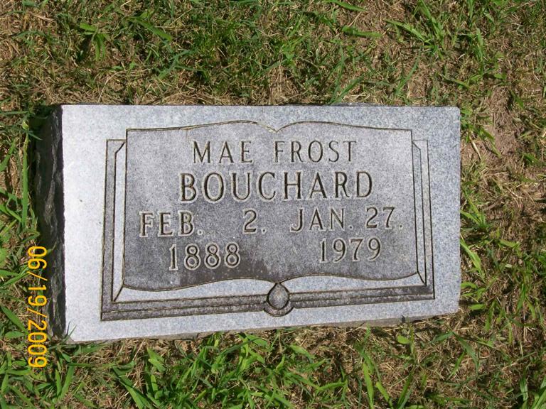 | BOUCHARD, Mae (FROST) | Feb. 2, 1888 | Jan. 27, 1979 | Research Note: She is buried in the Frost plot next to Elijah Andrew Frost, her father. Her mother was Lavinia Elvira (Morris) Greenwood, Elijah's first wife. Married on May 14, 1876 in Barry Co., MO. | Note Donna Cooper Census Phyllis Long Photo BCG and HS |