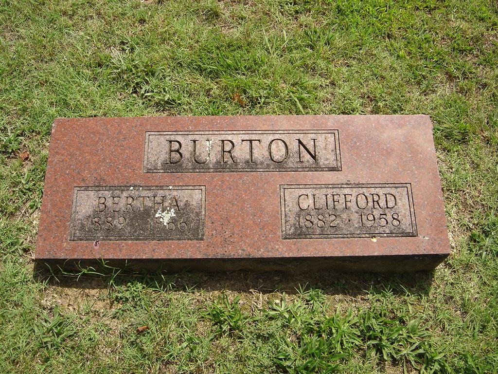 SSW: Bertha - Research Note: Culver's Funeral Home record reads that his father was William T. Burton and his mother Mary Ellen Townsend. His wife was named Bertha Sherwood Burton. He was a wholesale shoe salesman and the cause of death was given as broncho pneumonia. - Cassville Democrat, August 28, 1920 - Burton and Milford Tydings of Coweta, Okla., who have been visiting their grandmother, Mrs. Mary E. Burton and their Uncle Cliff Burton and family, left Tuesday for Sarcoxie, where they will visit their uncle, Capt. Tydings and family. | Photo BCG and HS Culver's Funeral Home, V. 8, P. 43, by Ted Roller Donna Cooper Online Newspapers Census Phyllis Long |