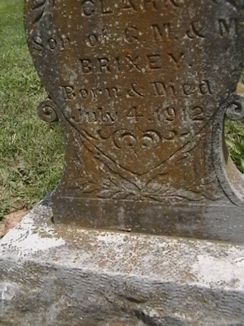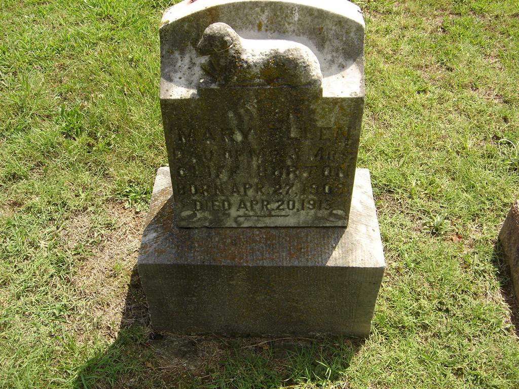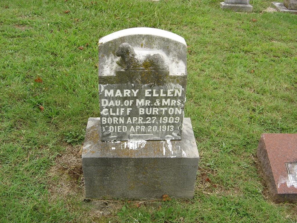 Inscription: "Mary Ellen - Dau. of Mr. and Mrs. Cliff Burton" - Research Note: April 10, 1913, Thursday, Cassville Republican, Barry Co., MO - Mary Ellen, little daughter of Mr. and Mrs. Cliff Burton of near Exeter, died about 12 o'clock Sunday of scarlet fever. Mary was 3 years, 11 months and 24 days old and was ill only a few days. The funeral was held Monday afternoon at the residence and interment was made in the Oak Hill Cemetery at Cassville. Another Photo - Another Photo | Online Newspapers Phyllis Long Photos BCG and HS |