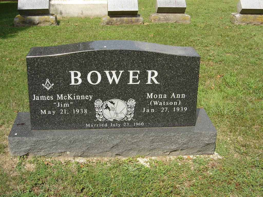 | BOWER, Mona Ann (WATSON) | Jan. 27, 1939 | No Date | SSW: James McKinney - Inscription: "Married July 23, 1960" - Research Note: Daughter of Rev. Paul Franklin Watson and Pearl Leona Edens, both buried at Oak Hill Cemetery. - Another Photo | Census Phyllis Long Photos BCG and HS |