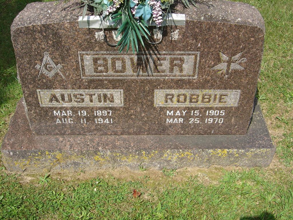 SSW: Austin J.- Research Note: Culver's Funeral Home records have listed that Robbie was age 64 years old and had lived in the Joplin area for thirteen years. Her address was 206 N. Byers, Joplin, MO. Her father was Jesse Towe and her mother Rosa Hobbs. Her son was his closest relative and he was named James M. Bower of Monett, MO. She was a cafe owner and her husband was given as Austin Bower, deceased. - Another Stone | Photo BCG and HS Culver's Funeral Home, V. 14, P. 18, by Ted Roller Donna Cooper Photo BCG and HS |