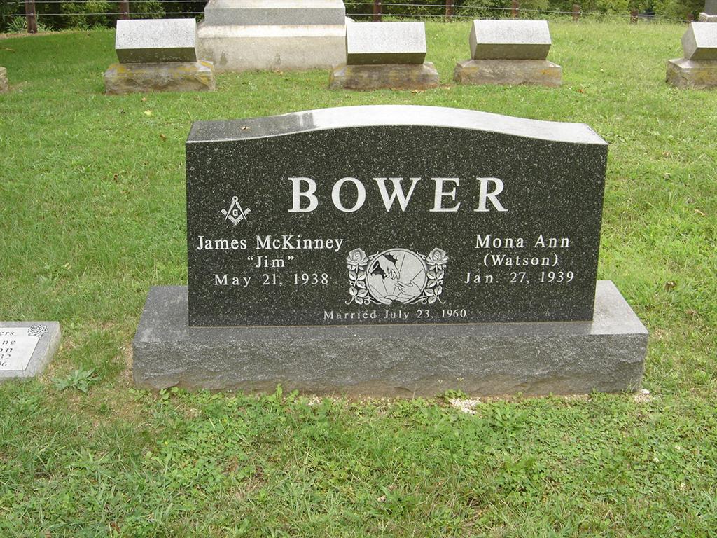 SSW: Mona Ann Watson - Inscription: "Married July 23, 1960" - Research Note: Son of Austin J. Bower and Robbie Elizabeth Towe. On July 23, 1960, at the First Baptist Church in Cassville, he married his high school sweetheart and best friend, Mona Ann Watson, who survives. They moved to Joplin, MO, residing there until July 1966, then moving to Neosho, Monett and back to Cassville in 1974. Jim was employed by the Natural Gas Company for thirty-two years. Upon retiring he delivered newspapers, delivered furniture, and drove cars for Les Jacobs Ford until his health started to decline. Jim became a Christian in his early years and was an active member of the First Baptist Church and a door greeter on Sunday. He was a very busy individual, a 1956 Cassville High graduate, lettering in football, basketball, and track. Jim was the "First" Wildcat to be selected as the Big Nine All Conference Football Halfback. Upon graduation he attended Southwest MO State College in Springfield, MO. Jim then went on to serve in the Army with the 101st Airborne Paratroopers also known as the "Screaming Eagles." One of his greatest honors was being selected to go on the Veterans Honor Flights to Washington D.C. Jim so enjoyed with pride and gratefulness this trip and honor. He was an avid quail hunter and enjoyed his yearly fall hunts with his setter and pointer dogs and his best longtime friend, Jim, and many more friends and cousins. He was a member of the Masonic Lodge, enjoyed fishing, collecting arrowheads, carnival glass and coins. Jim was an avid softball player and fast pitch pitcher. He also was a football referee and enjoyed interacting with the area football coaches. Jim also enjoyed being Secret Santa during Christmas. He served on the board of the Oak Hill Cemetery as past president as well the Cassville High School Alumni, past president, and Cassville High School Booster Club Member. In Joplin at Forest Park Baptist Church, Jim and Mona taught boys and girls intermediate Sunday school class and interacted with "Big Brothers." They were active with youth in Monett and after moving to Cassville they worked with the youth at First Baptist Church. Jim and Mona loved people, especially the youth, they opened their home to many young men. Jim will be greatly missed by his wife of 63 years; one sister-in-law; five nephews; four nieces; additional family members and many great nephews, nieces, cousins, friends and most of all his furry friends, Bridgett, Billie, Butch and Birdie the cat. Jim was preceded in death by his parents; two sisters, Johnnie Louise Ketaily and Roetta Jane Thompson; four brothers-in-law, George Sitler, Corley Griffith, Edward Ketaily, Kenny Thompson and same as brother, William "Rocky" Edmondson.Another Photo | Fohn Funeral Home L. Pearce Mother's Funeral Record FindagravePhyllis Long Photos BCG and HS |