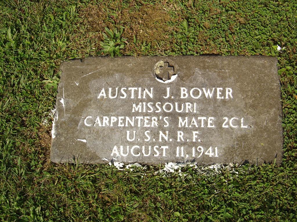 SSW: Robbie - Research Note: According to his death certificate he was a foreman at the MO State Highway Garage. His wife was Robbie Elizabeth (Towe) Bower. He was a son of James Monroe Bower and Lula McKinney, both born MO. The cause of death was a skull fracture caused from fall at work. Austin's first wife Lela (Vanzandt) Bower is buried at Corinth. She died Oct. 21, 1922. Donna's Note: The death certificate says that Austin was born 1899 the stone reads 1897. - Cassville Republican, Thursday, January 2, 1919 - Miss Nadine Robbins entertained at her home Monday evening in honor of Austin Bower who is here on a short furlough from the Great Lakes training camp. - Same paper - Austin Bower arrived Saturday night from the Great Lakes training camp and remained to Wednesday on a visit with his parents, Mr. and Mrs. J. M. Bower. He is looking fine. - Cassville Republican, Thursday, February 6, 1919 - Austin Bower, son of Mr. and Mrs. J. M. Bower, has returned from the Great Lakes Naval training camp having received his discharge. - Military Stone - Inscription: "MISSOURI - CARPENTER'S MATE 2 CL - U. S. N. R. F." | Death Certificate Online Newspapers Phyllis Long Photos BCG and HS |